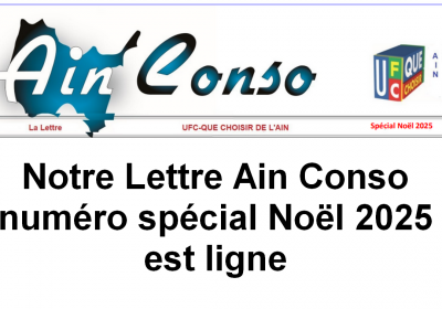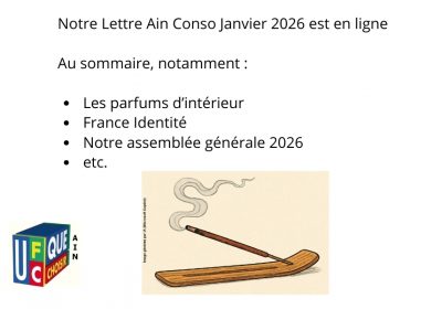 Pour lire notre « lettre Ain Conso » Janv 2026, c’est ici Et pour consulter nos précédentes parutions, c’est ce lien Un litige ? Contactez nous : UFC-QUE CHOISIR DE L’AIN Tél : 04.74.22.58.94 Mail :... -