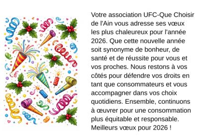 Un litige ? Contactez nous :UFC-QUE CHOISIR DE L’AINTél : 04.74.22.58.94Mail : contact@ain.ufcquechoisir.fr Notez cette date : Assemblée générale 2026 : elle aura eu lieu le samedi 21 mars à 10 heures à la Maison de la Culture et de la Citoyenneté 4 allée... -