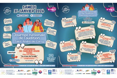 - Le samedi 31 janvier de 9h à 13h : tests auditifs gratuits, atelier voyages sonores, atelier ergothérapie, présence d’un atelier jeux par Lud’ O Dombes, atelier sport adapté, exposition sur le bruit.